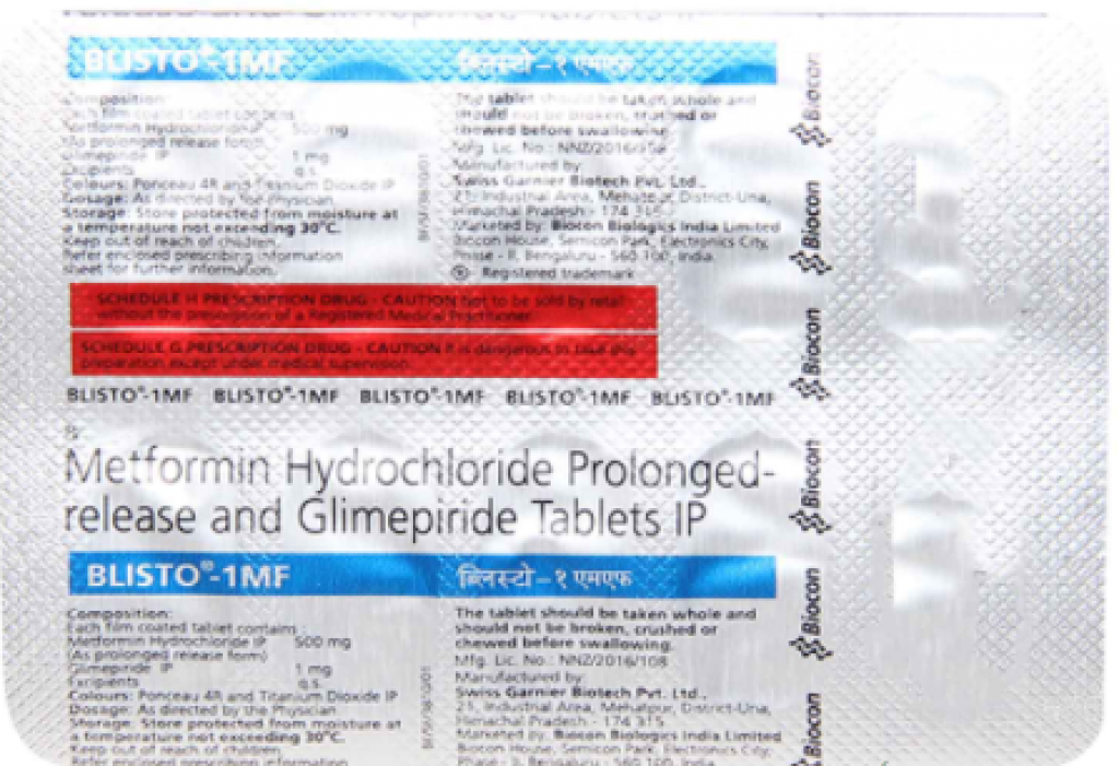 Blisto 1MF Tablet PR belongs to a category of medicines known as anti-diabetic drugs. It is a combination of two medicines used to treat type 2 diabetes mellitus in adults. It helps control blood sugar levels in people with diabetes.